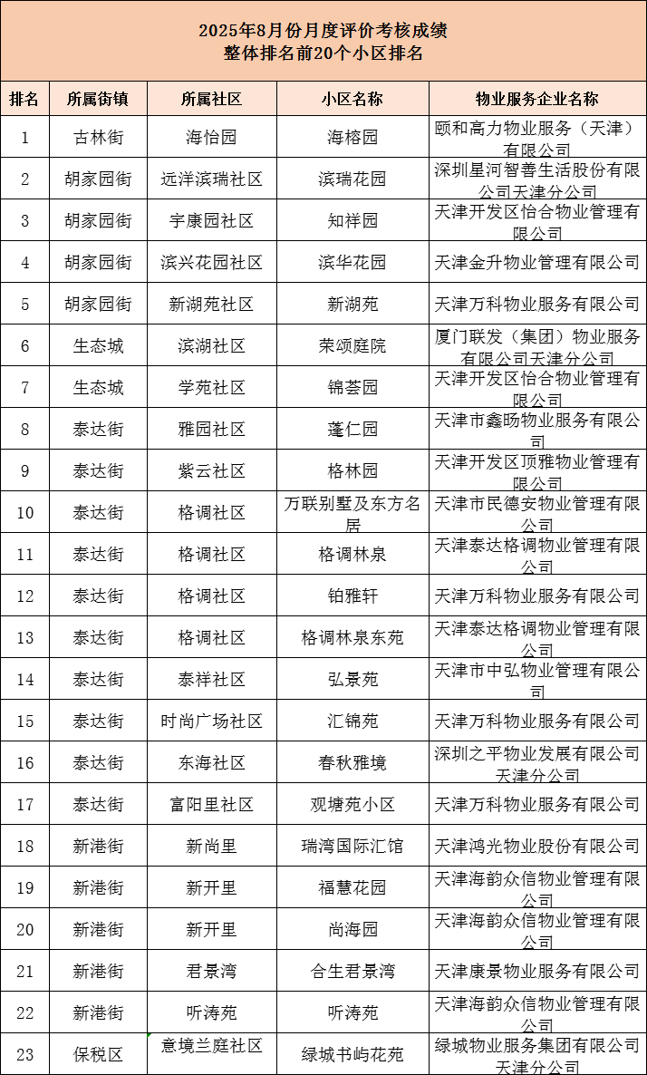 根据《关于印发〈滨海新区专业化物业管理住宅小区星级评价考核办法〉(试行)的通知》等相关文件规定,各街道办事处(镇政府)、各开发区社区管理部门组织对专业化物业管理住宅小区开展了月度评价考核。现将2025年8月份月度评价考核成绩整体排名中前20名和后20名小区(有同分情况)及各街镇、开发区辖区内全部住宅小区排名公布如下: